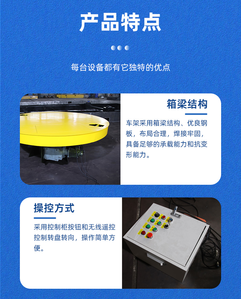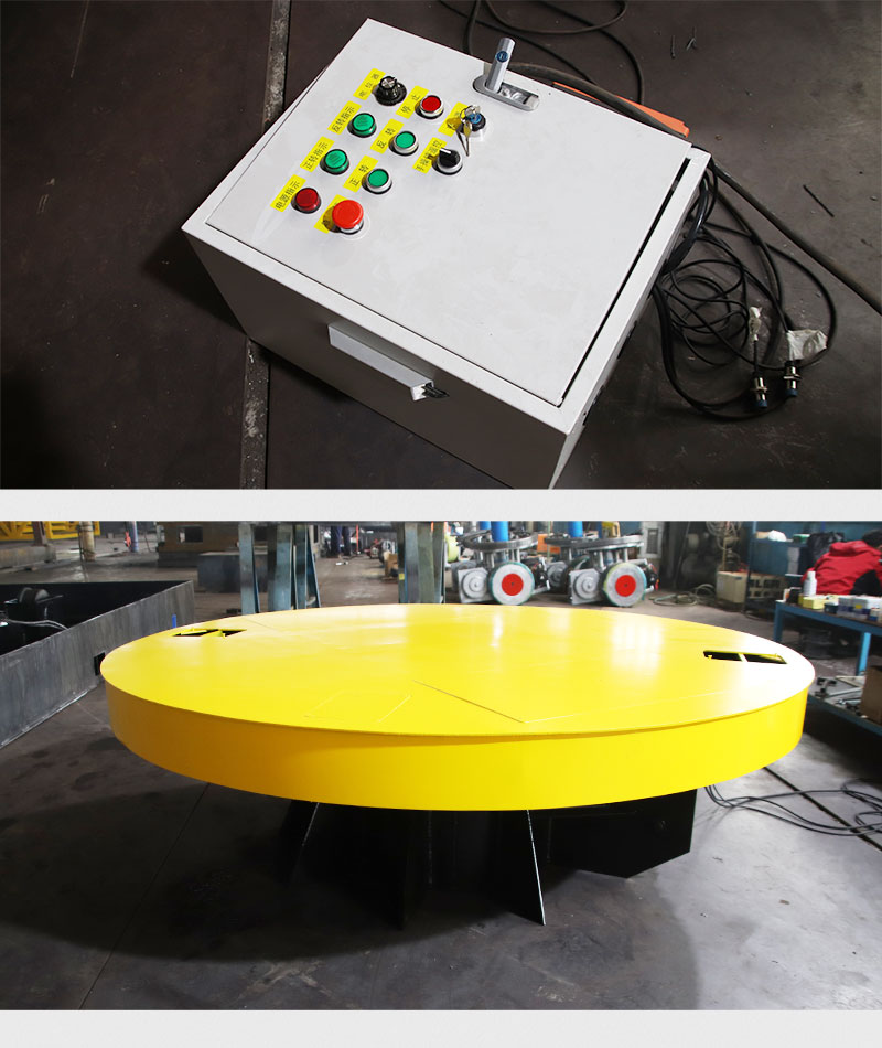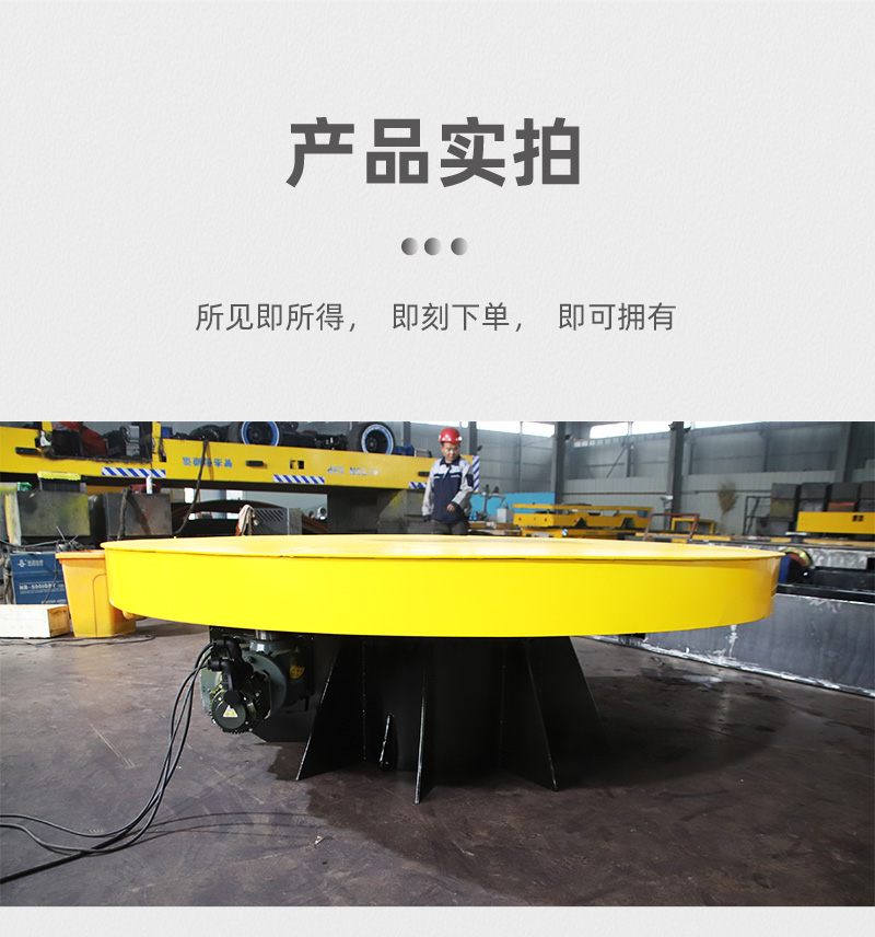 描   述: 工業(yè)重載電動轉(zhuǎn)盤平車換向旋轉(zhuǎn)臺,轉(zhuǎn)盤直徑2米高1.3米額定載重5噸,主要用于工業(yè)生產(chǎn)車間道岔口地軌車的90°換向,采用控制柜按鈕操作,簡單方便。