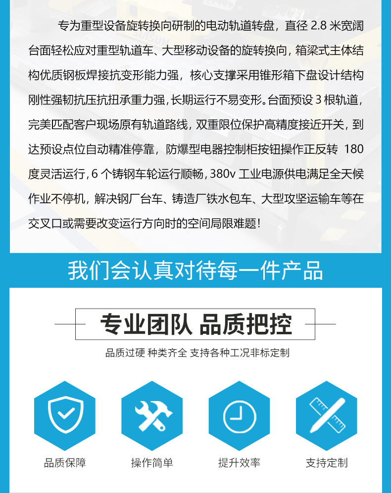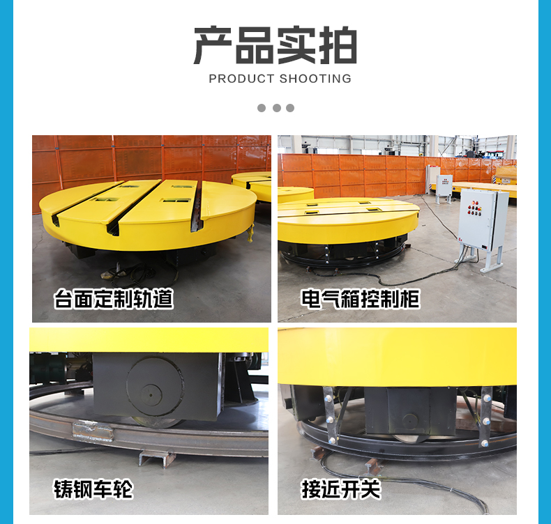 描   述: 車間內(nèi)大型工件運輸車掉頭換向難,人工推不動?快來看看這款專為大型地平車、軌道運輸車輛量身定制的智能轉向電動轉盤,直徑載重功能通通支持非標定制!