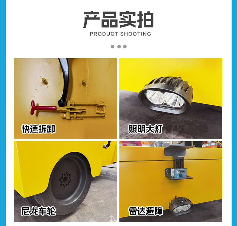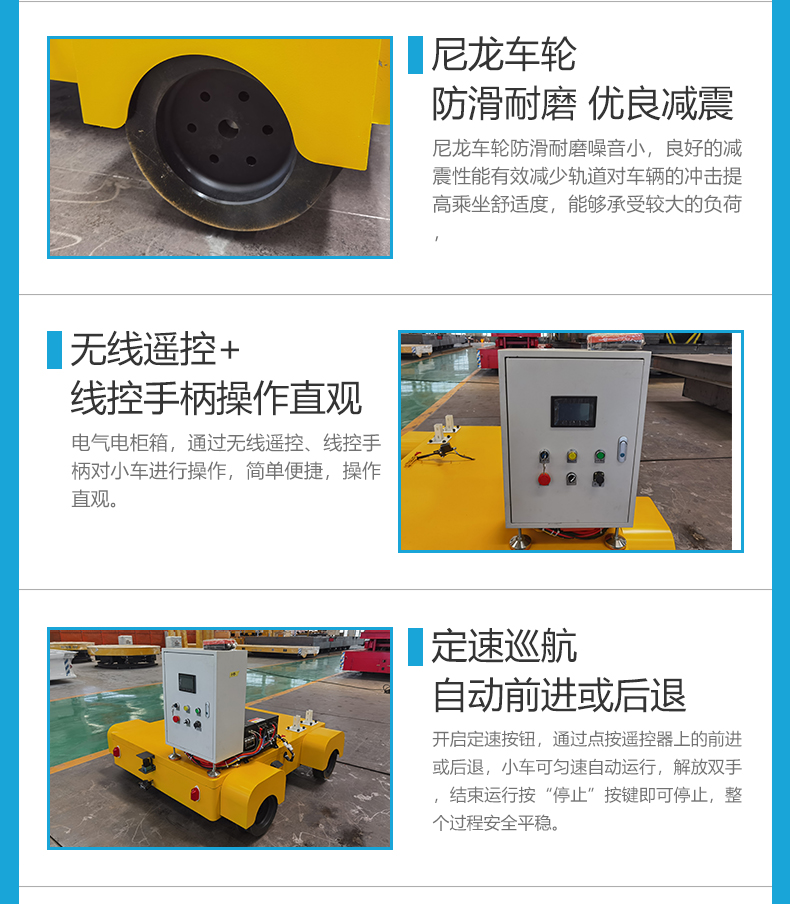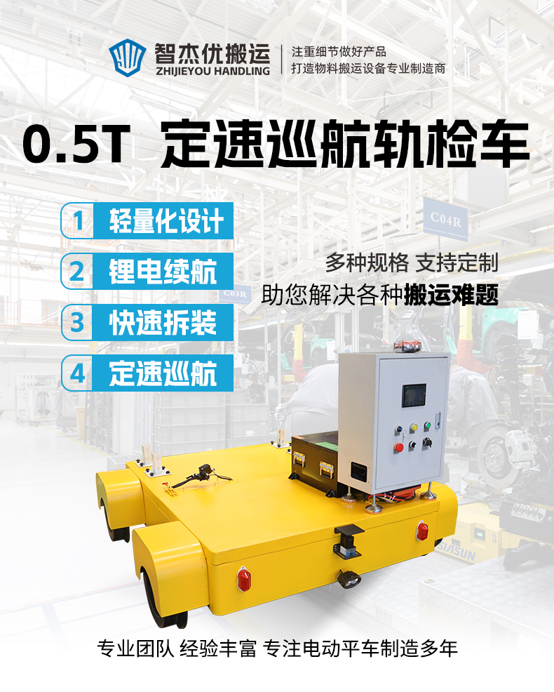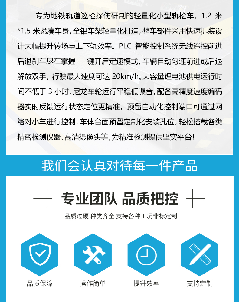描   述: 鋁合金地鐵軌道巡檢車,用于搭載檢測設(shè)備對地鐵軌道進行探傷檢測作業(yè)的移動平臺,整車模塊化設(shè)計可快速拆裝,方便上下軌搬運,小車長1.2米寬1.5米額定載荷0.5噸,臺面預(yù)留安裝孔位方便檢測儀器、探傷裝置、高清攝像頭組等設(shè)備安裝,PLC智能控制系統(tǒng)無線遙控前進后退剎車盡在掌握,一鍵開啟定速模式,車輛自動勻速前進或后退解放雙手。