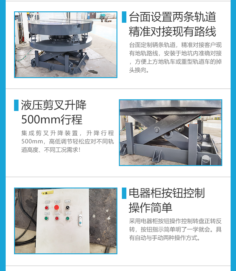 描   述: 軌道車掉頭換向費勁兒?復(fù)雜工況對接不上?這臺剪叉升降式電動軌道轉(zhuǎn)盤專為復(fù)雜工況軌道車調(diào)頭換向定制!不止能轉(zhuǎn)!集成剪叉升降裝置,500mm高低調(diào)節(jié)輕松應(yīng)對不同軌道高度、不同工況需求!是車間物流周轉(zhuǎn)的強力輔助!
