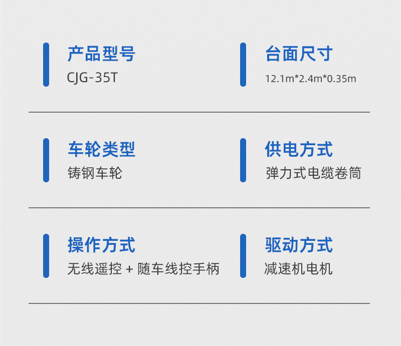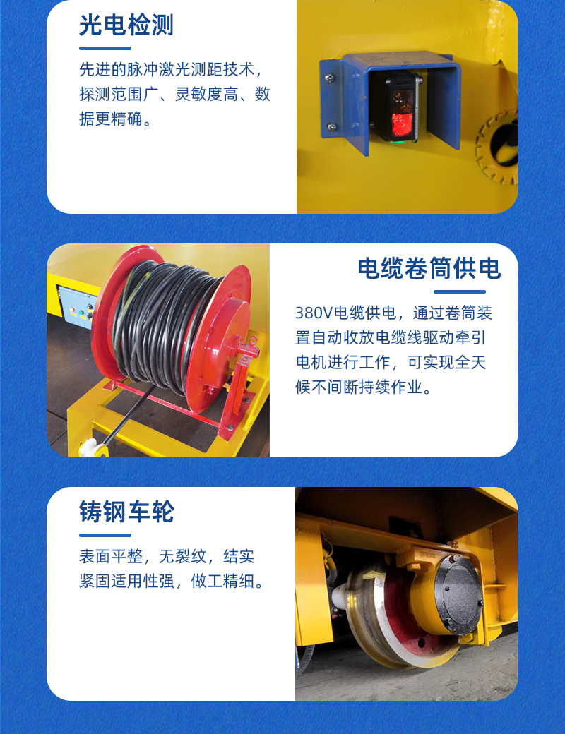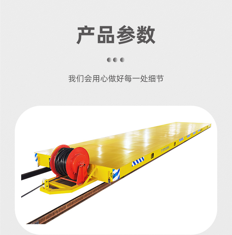 描   述: 重載軌道搬運車,長12米寬2.4米高0.35米額定載重35噸,采用電纜卷筒供電式可遠距離長時間頻繁運輸,無線遙控操作簡單方便,安全裝置配備齊全,解決企業(yè)重型物料搬運難題!