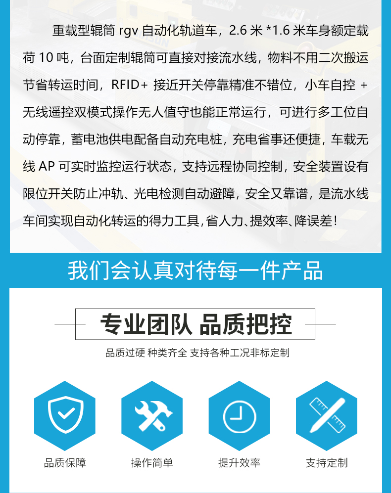 熱線:15517329551 無人值守自動轉(zhuǎn)運自動化RGV輥筒軌道車,1.6米*2.6米額定載荷10噸,臺面集成輥筒裝置,支持正反轉(zhuǎn)無級調(diào)速,可輕松對接產(chǎn)線、工作臺或輸送機,實現(xiàn)物料平穩(wěn)、柔性化轉(zhuǎn)運,融合RFID站點識別與高精度接近開關(guān)雙重定位技術(shù),支持多點位自動停靠,配備車載無線AP,無縫接入工廠物聯(lián)網(wǎng)系統(tǒng),支持遠程中央調(diào)度與實時監(jiān)控,任務(wù)指令一鍵下達,無人值守自主運行,??课恢?**可靠,PLC控制邏輯嚴謹響應(yīng)迅速,確保復(fù)雜環(huán)境長周期連續(xù)運行穩(wěn)定可靠。蓄電池供電設(shè)有自動充電樁智能監(jiān)控電量信息,極限限位杜絕沖軌風(fēng)險,光電感應(yīng)遇障即停,安全性直接拉滿!