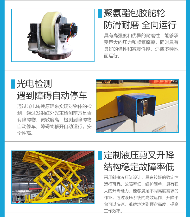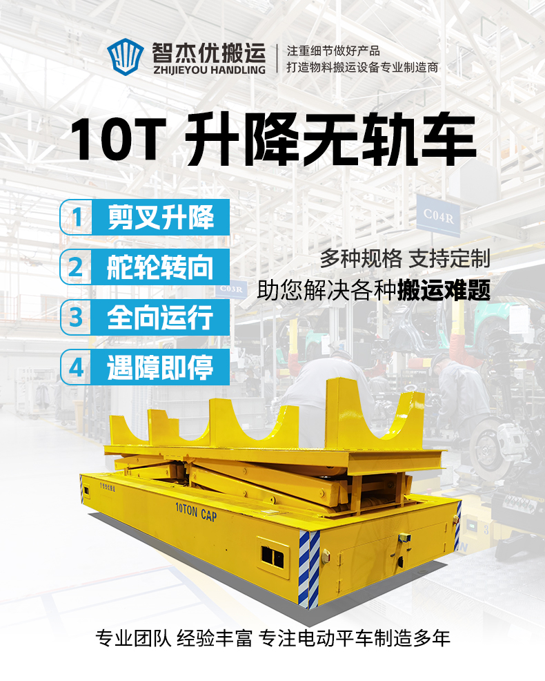 熱線:15517329551 智杰優(yōu)搬運(yùn)為鐵路隧道施工定制的10噸升降全向無軌搬運(yùn)車,整車長6米寬2.4米高1.3米額定載重10噸。臺面加裝大型液壓剪叉升降裝置定制動力單元升降行程2.4米,無線遙控操作上下升降簡單靈活,輪系配備舵輪搭配萬向輪可全向移動,舵輪轉(zhuǎn)向穩(wěn)定靈活控制***,可實(shí)現(xiàn)縱橫移動、原地旋轉(zhuǎn)、米字斜行等運(yùn)動控制,狹窄工況環(huán)境下可***??客瓿身斏徇\(yùn)作業(yè),升降平臺上方定制4個U型置物架,極限頂升狀態(tài)下也能確保物料安全!