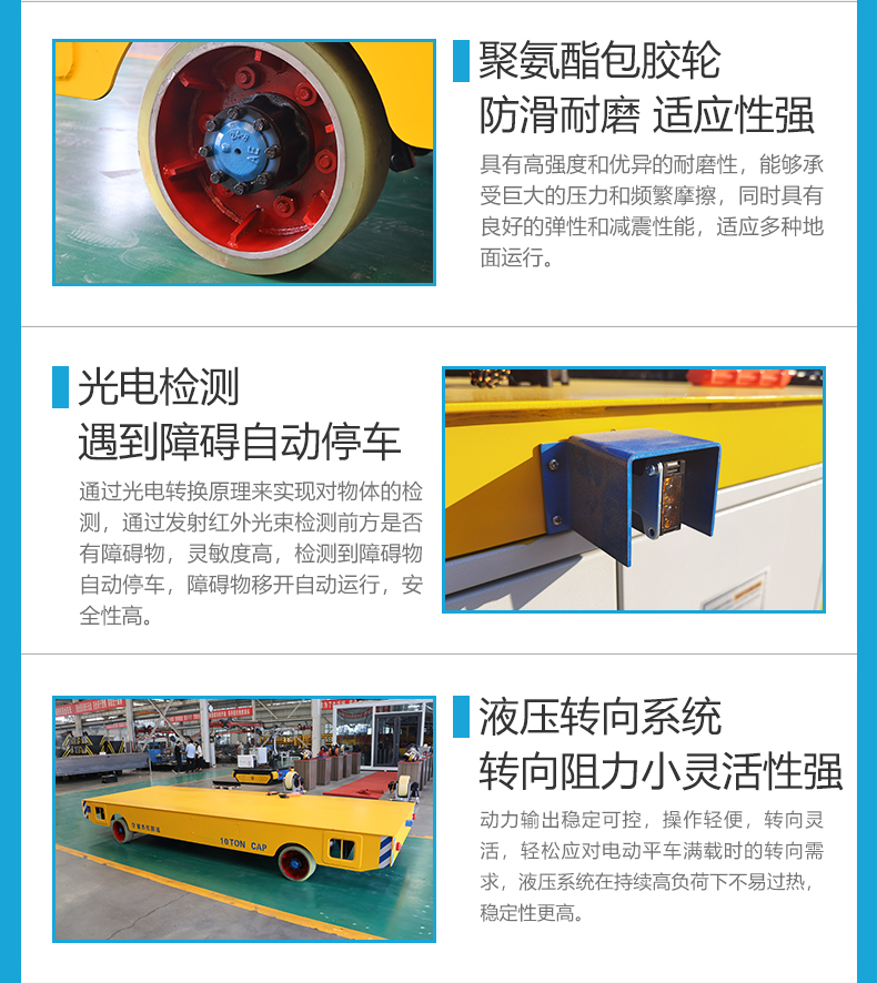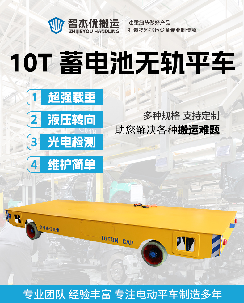 描   述: 5米*1.8米平臺(tái)0.65米低重心設(shè)計(jì),適配10噸級(jí)重型物料,輕松承載鋼板、模具、機(jī)械鑄件等重型物料。減速機(jī)+電機(jī)驅(qū)動(dòng)系統(tǒng),動(dòng)力輸出澎湃穩(wěn)定,配備四個(gè)聚氨酯包膠車輪,防滑耐磨靜音運(yùn)行不傷地坪,室內(nèi)外場(chǎng)景運(yùn)行無憂,液壓轉(zhuǎn)向系統(tǒng)反應(yīng)靈敏,支持左右靈活轉(zhuǎn)彎,可在復(fù)雜狹窄工況自由運(yùn)行。大容量蓄電池供電零排放符合環(huán)保要求,人工無線遙控操作,前進(jìn)/后退/轉(zhuǎn)向一鍵切換,操作簡(jiǎn)單上手快,多重安全防護(hù)確保運(yùn)輸安全!
