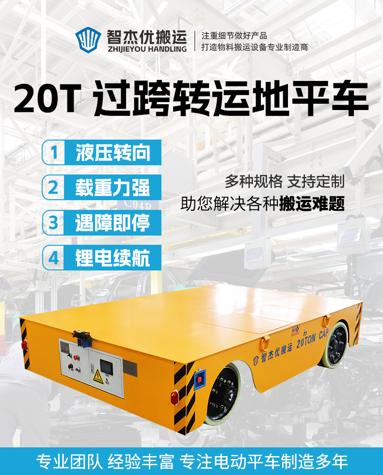 描   述: 您是否還在為跨車間轉(zhuǎn)運(yùn)物料而發(fā)愁?解決方案來了,智杰優(yōu)搬運(yùn)研制的液壓轉(zhuǎn)向無軌電動平板車,專為高效、靈活、安全的車間過跨轉(zhuǎn)運(yùn)而生!