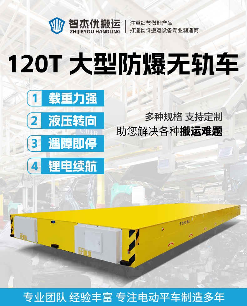 描   述: 120噸級(jí)防爆液壓轉(zhuǎn)向無(wú)軌車,集***承載、防爆安全與智能控制與一身的大型重載無(wú)軌車,適用于大型制造業(yè)、重型機(jī)械廠、鋼結(jié)構(gòu)施工、防爆要求車間等重載搬運(yùn)場(chǎng)景!