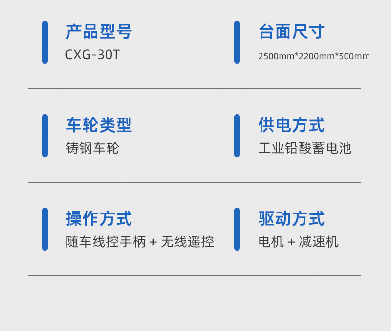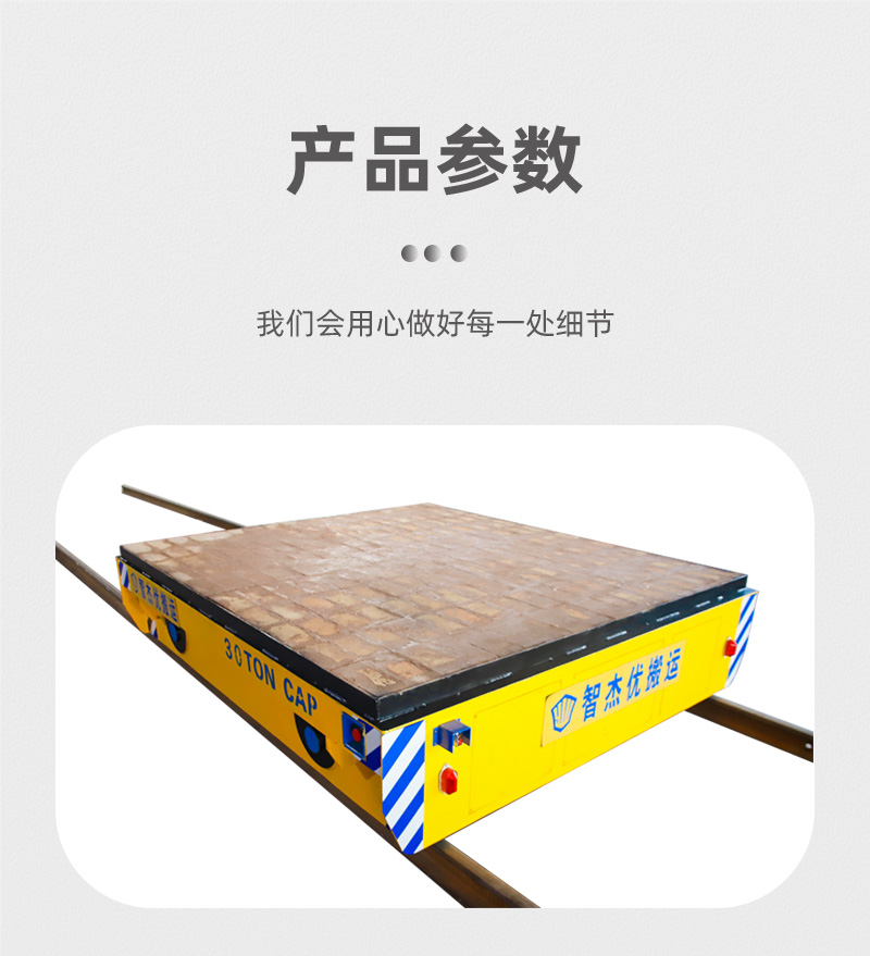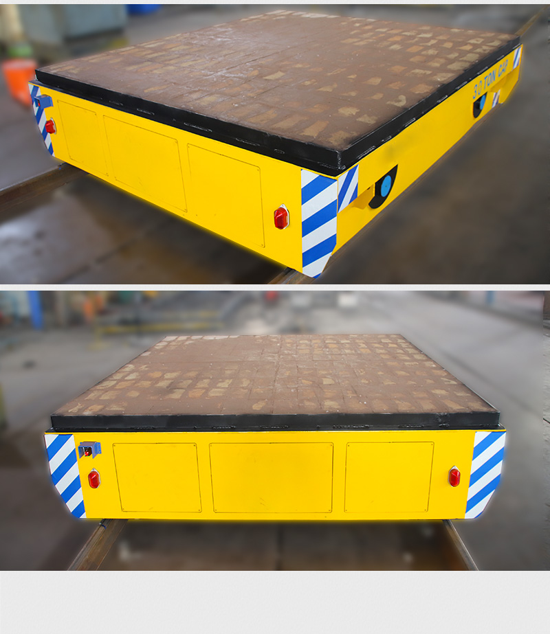 描   述: 這是一臺山東客戶定制的蓄電池軌道電動平車,該車長2.5米,寬2.2米,高0.5米,車架箱型梁焊接,結(jié)構(gòu)牢固,載重量大,可載重30噸,應客戶使用要求,臺面鋪設耐火磚;平車采用蓄電池供電,運行距離不受限制,遙控器一鍵操作,可啟動停止、前進后退、調(diào)速等,設有雙限位開關,可根據(jù)現(xiàn)場設定地點自動??浚昂蠊怆姍z測,遇障自停,聲光報警保障安全,能夠在垂直軌道、L型軌道、S型軌道、弧形軌道及易爆、擺渡場合使用。