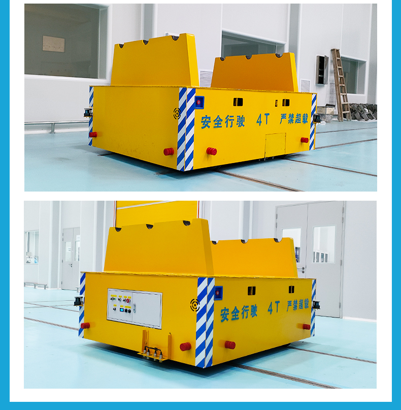 描   述: 智杰優(yōu)搬運(yùn)制造的縱橫移動(dòng)軌道車,整車長2米寬1.8米高0.75米額定載重4噸,客戶用于銅箔卷的跨車間運(yùn)輸作業(yè)。車架箱梁結(jié)構(gòu)結(jié)實(shí)耐用,臺(tái)面鋪設(shè)2mm304花紋鋼板,兩側(cè)裝有輥軸支架,用于放置銅箔卷。配備8只鑄鋼車輪可進(jìn)行上下升降變軌實(shí)現(xiàn)軌道車縱橫移動(dòng),根據(jù)軌道鋪設(shè)路線十字交叉運(yùn)行,進(jìn)行跨車間的物料運(yùn)輸,定位傳感器限位開關(guān)控制軌道車停車精度,提前減速緩慢停車***換軌自動(dòng)運(yùn)行。