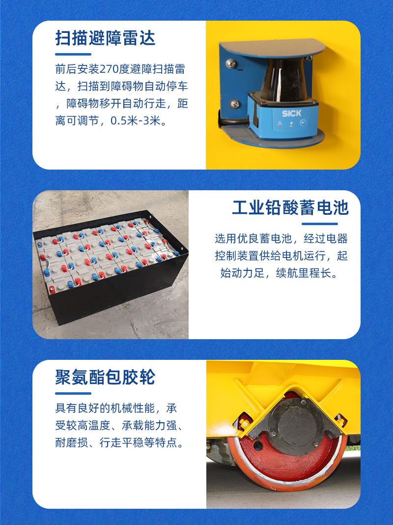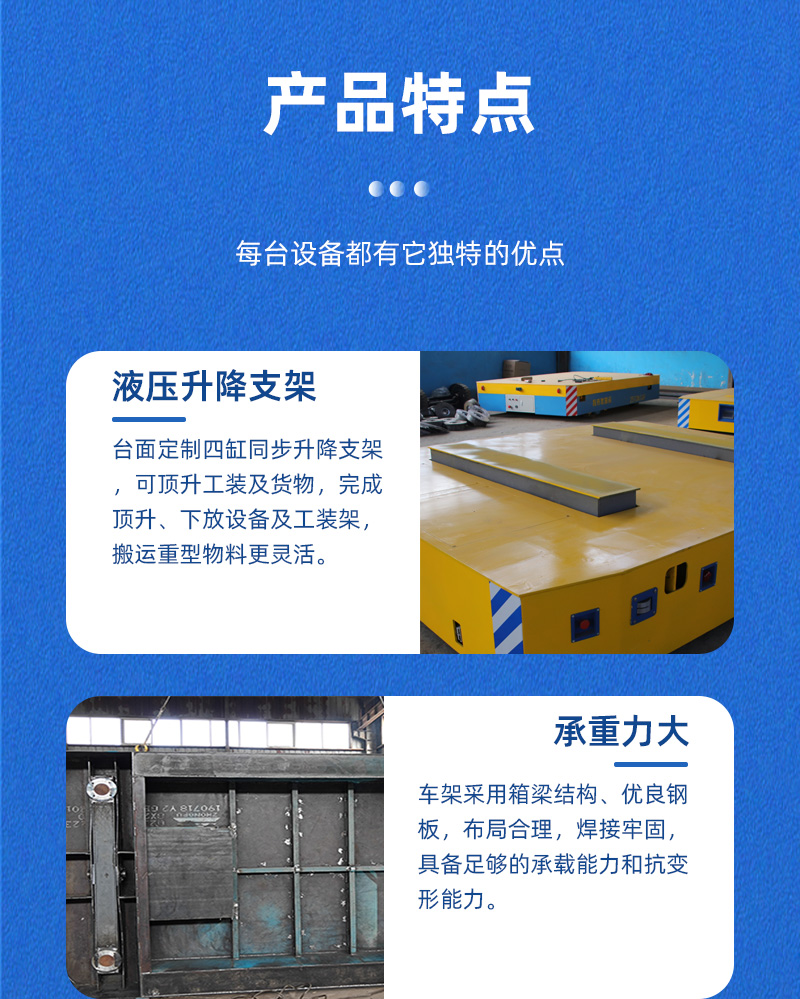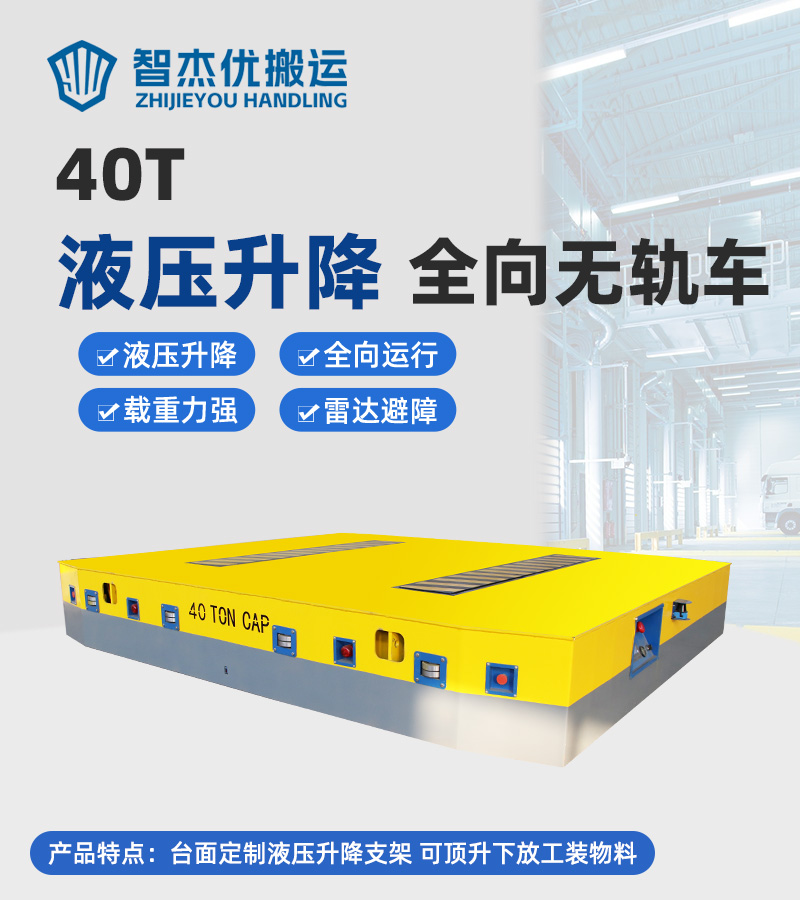 熱線:15517329551 這是一臺液壓升降全向無軌車客戶使用現(xiàn)場,長3.5米寬3米高0.55米額定載重40噸,主要用于車間內(nèi)風電設備部件的轉(zhuǎn)運作業(yè)。電機減速機驅(qū)動平車運行,蓄電池供電運行路線不受線纜限制,臺面定制液壓升降支架,可頂升工裝架,升降行程200mm,輪系采用聚氨酯包膠輪搭配萬向輪可實現(xiàn)全向運行,車間柱子阻礙下也能靈活調(diào)整方向輕松通過。無線搖桿操作控制平車運行及升降,可鉆入工裝下,完成頂升、運輸、下放工裝等動作,車體四周設有防撞滑塊,急停開關,前后安裝270度避障雷達,遇障即停,確保全向車安全往返運輸作業(yè)!