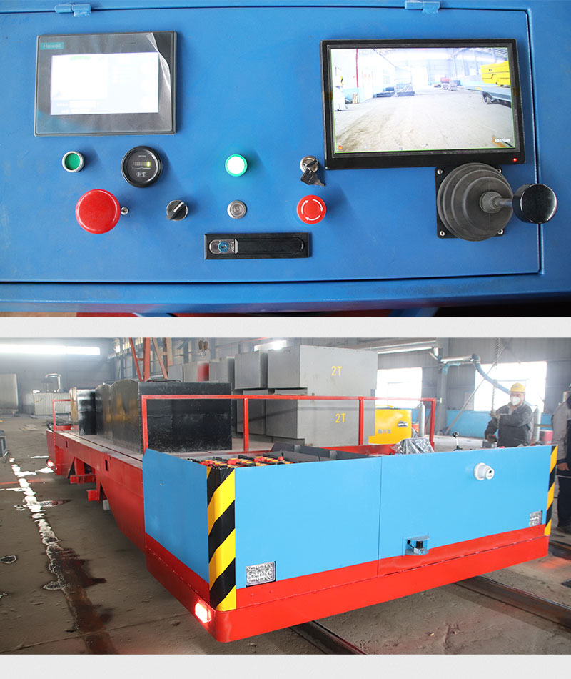 描   述: 軌道牽引電動平車,該車即可為無動力車輛提供牽引動力,自身也可搬運重物使用,整車長5.2米寬2.8米高0.8米載重40噸,平車前端設(shè)有駕駛位,可人工駕駛推桿操控平車前進后退。加減速,也可遠距離無線遙控作業(yè),平車配備PLC顯示屏,實時顯示車輛狀態(tài)信息,同時配備前置射影像視屏,實時顯示前方路況實況,避免碰撞,示廓燈、攝像頭、激光雷達270度自動掃描避障,平車后方設(shè)有牽引裝置,滿足牽引作業(yè)需求。