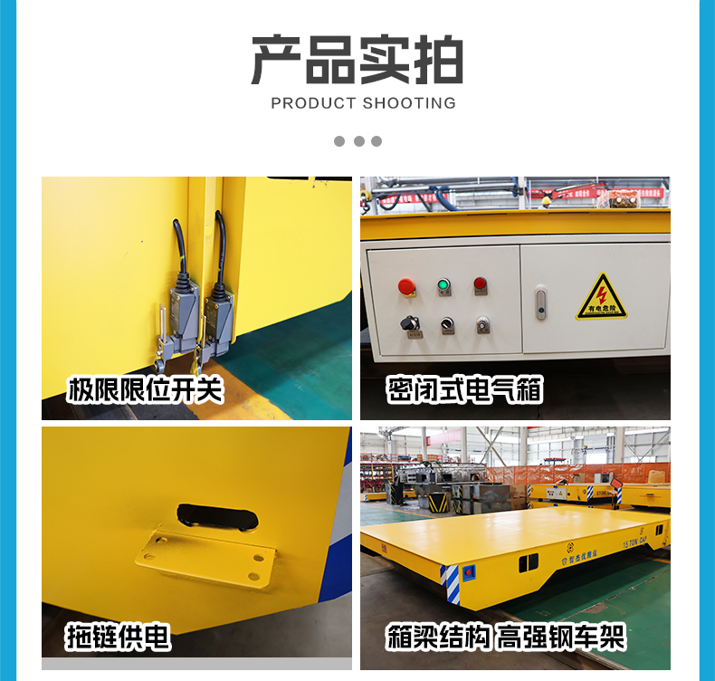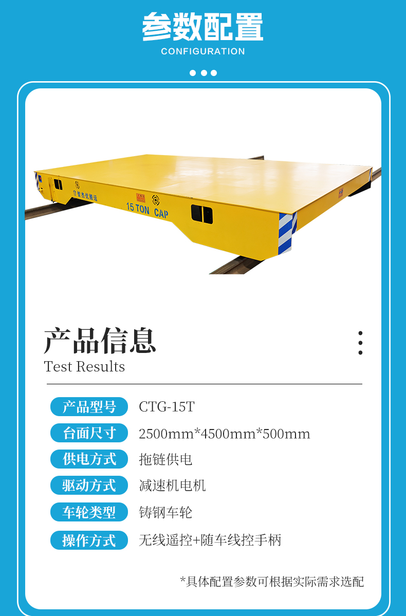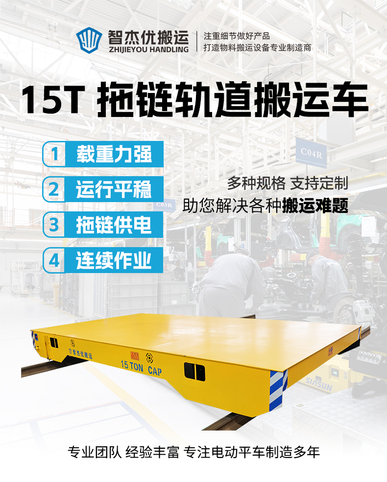 描   述: 專為短距離重型物料轉(zhuǎn)運定制的拖鏈供電軌道平車,長2.5米寬4.5米平臺設(shè)計,0.5米低重心設(shè)計,車架高強鋼焊接箱梁結(jié)構(gòu)穩(wěn)定牢固,可承載15噸的貨物,電機減速機驅(qū)動系統(tǒng),動力輸出穩(wěn)定強勁,啟停平穩(wěn)無沖擊,采用拖鏈供電系統(tǒng)支持來回往復(fù)運行,告別傳統(tǒng)電纜磨損難題,可滿足全天候搬運作業(yè)需求,無續(xù)航焦慮,輕松應(yīng)對設(shè)備零部件、鋼材、設(shè)備半成品等重型物料!