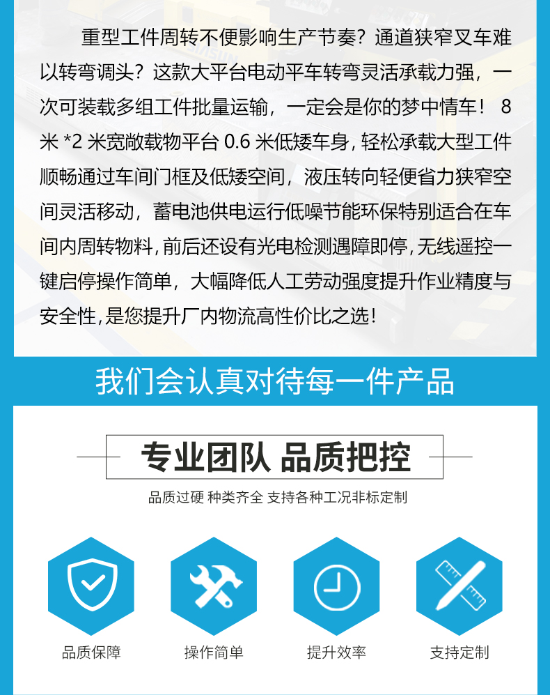 描   述: 重型工件周轉(zhuǎn)不便影響生產(chǎn)節(jié)奏?通道狹窄叉車難以轉(zhuǎn)彎調(diào)頭?這款大平臺電動(dòng)平車轉(zhuǎn)彎靈活承載力強(qiáng),一次可裝載多組工件批量運(yùn)輸,一定會(huì)是你的夢中情車!