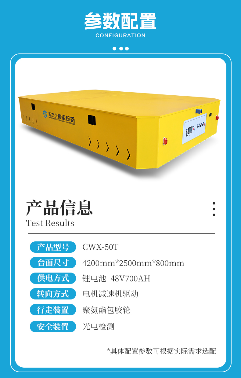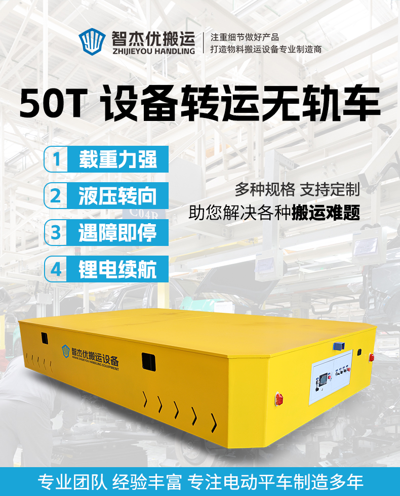 描   述: 重型設(shè)備半成品車間流轉(zhuǎn),用它一車搞定!4.2米*2.5米寬大平臺,20mm加厚臺面箱梁結(jié)構(gòu)承載力強,50噸重型設(shè)備半成品輕松轉(zhuǎn)運,無軌設(shè)計液壓轉(zhuǎn)向,可在車間自由靈活移動。