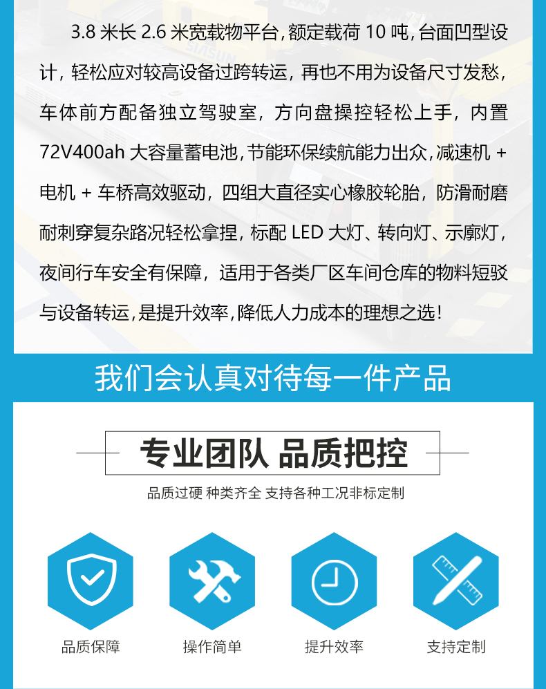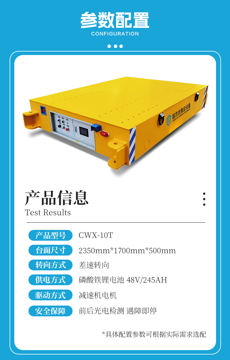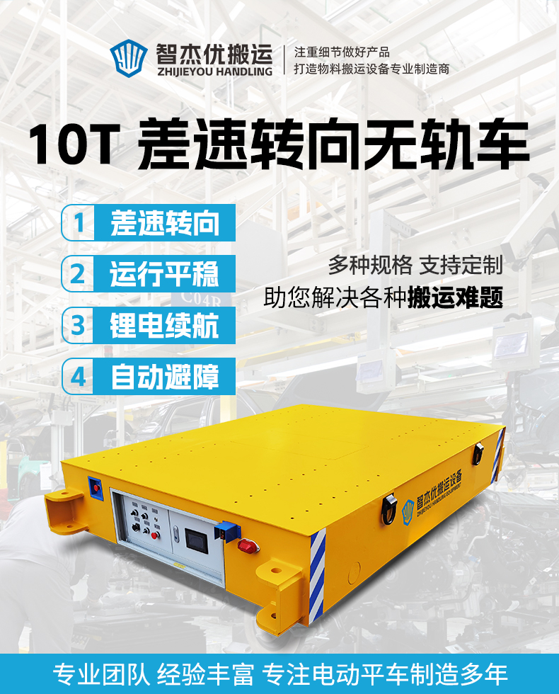 描   述: 長(zhǎng)2.4米寬1.7米額定載荷10噸,0.5米低重心設(shè)計(jì)方便物料上下裝卸,滿載運(yùn)行平穩(wěn)轉(zhuǎn)向靈活流暢,無線遙控操作便捷指令接受響應(yīng)迅速,大扭矩減速機(jī)電機(jī)驅(qū)動(dòng)力足爬坡輕松不費(fèi)力,差速轉(zhuǎn)向轉(zhuǎn)彎半徑小狹窄通道靈活騰挪,光電檢測(cè)遇到障礙自動(dòng)停車,適用于大型設(shè)備、模具、原材料等進(jìn)行車間工序間的過跨轉(zhuǎn)運(yùn)!