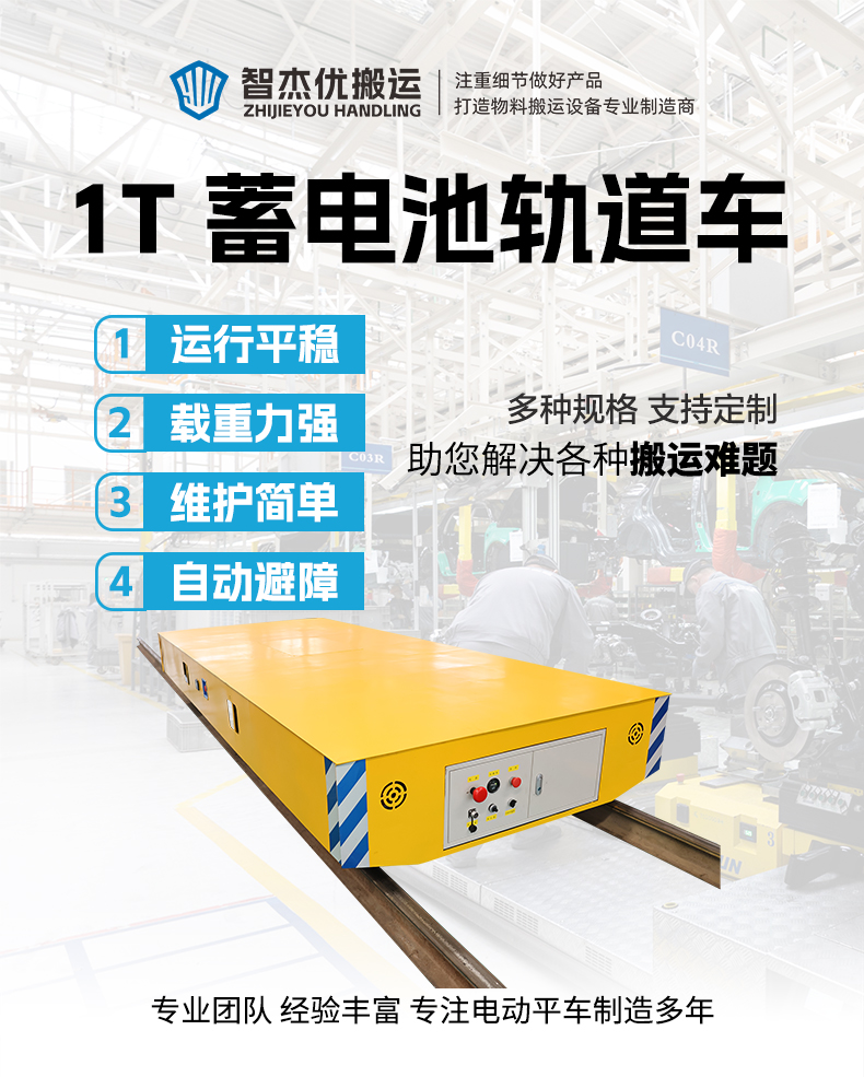 描   述: 蓄電池軌道電動(dòng)平車,整車長4米寬1.6米高0.5米額定載重1噸,客戶用于生產(chǎn)線零部件的轉(zhuǎn)運(yùn)。高強(qiáng)鋼車架箱梁結(jié)構(gòu)穩(wěn)定牢固承重力強(qiáng),工業(yè)蓄電池供電可根據(jù)運(yùn)行時(shí)間定制電池容量,軌道運(yùn)行穩(wěn)定可靠。高硬度鑄鋼車輪耐磨損壽命長,支持遙控/手柄多模式操控,靈活適配生產(chǎn)需求。配備聲光報(bào)警、斷電保護(hù)、緊急制動(dòng)、光電檢測,***守護(hù)作業(yè)安全。軌道式電動(dòng)平車多種供電方式可供選擇,蓄電池、滑觸線、低壓軌道、電纜卷筒。